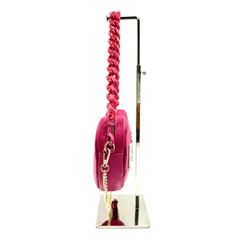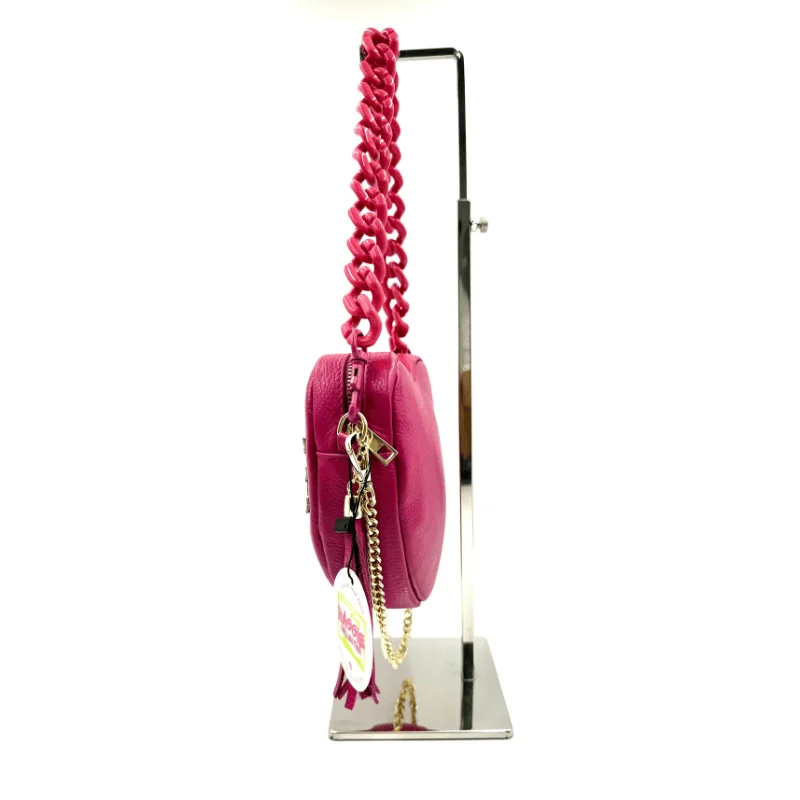A heart-shaped silhouette meets explosive fuchsia leather, while bold golden accents and its raised lettering turn it into a street-luxury icon.